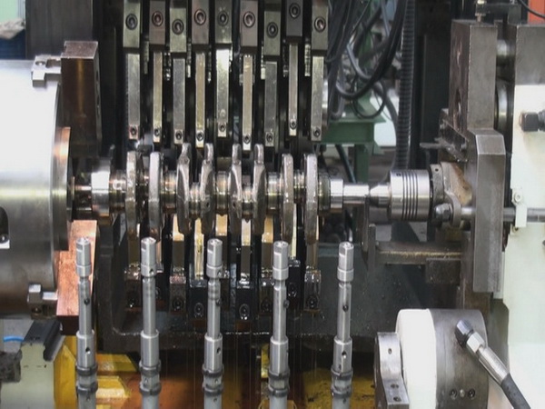 3.滾壓四缸機(jī)曲軸:滑臺(tái)橫向進(jìn)給,九個(gè)夾鉗油缸通過滾壓頭分別夾緊工件上各自對(duì)應(yīng)的主軸頸和連桿頸,此時(shí)潤滑油開。滾壓時(shí)九個(gè)夾鉗油缸按預(yù)定壓力進(jìn)行加卸載,按設(shè)定滾壓圈數(shù)完成滾壓。滾壓完成后滾壓裝置退出。